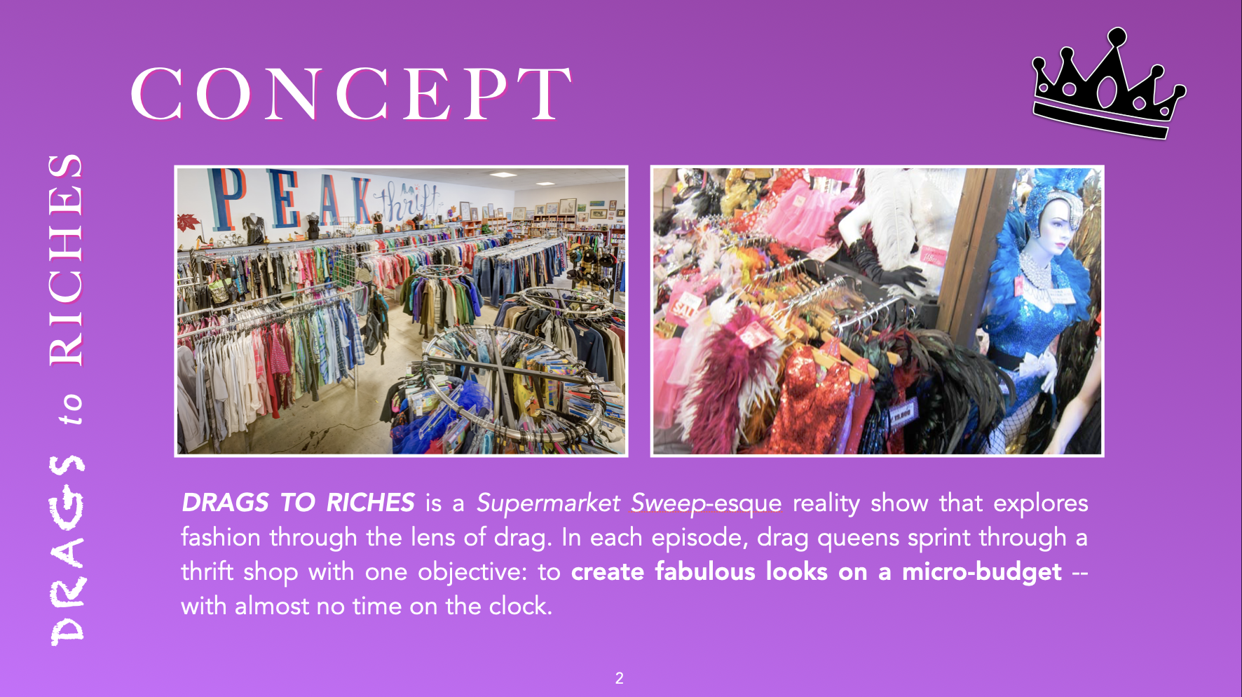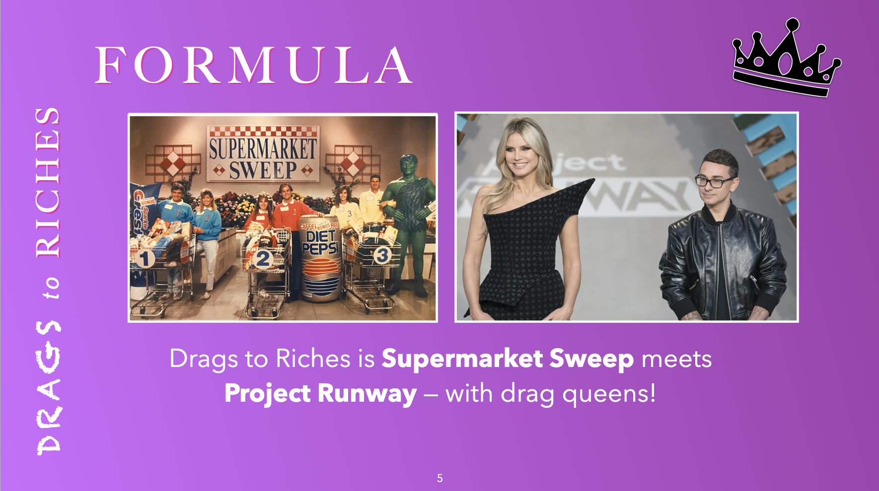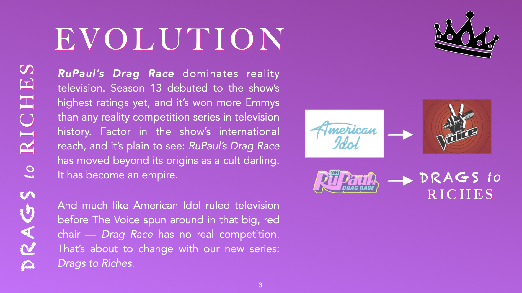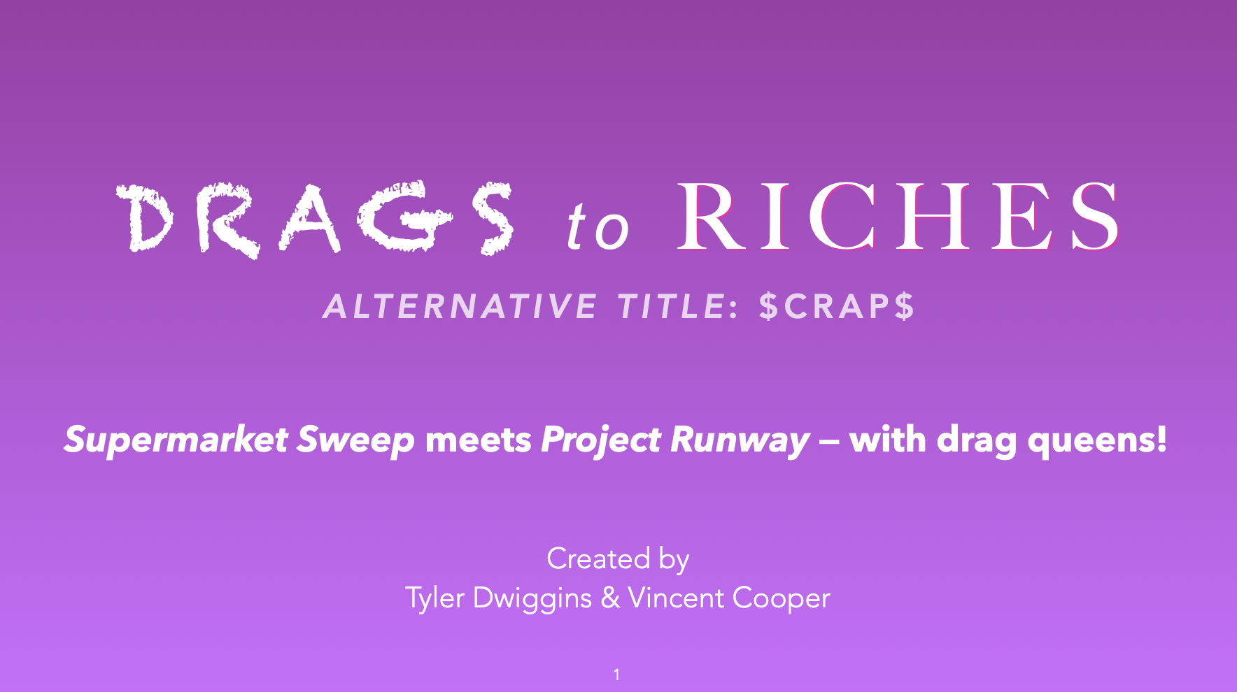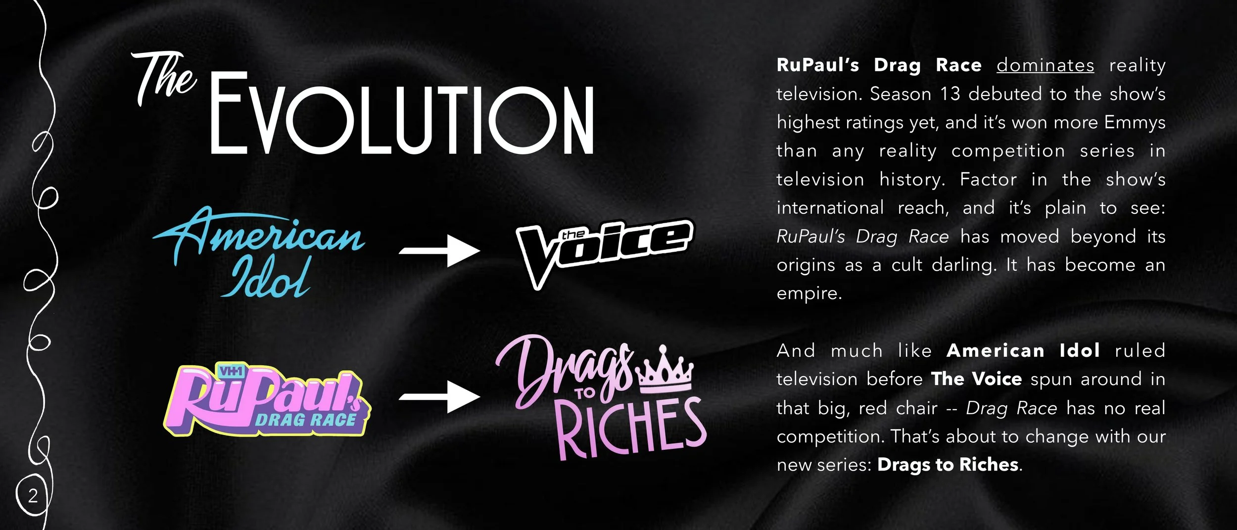 Drags to Riches is a drag-themed unscripted project that needed a presentation to match its personality. Working closely with the creators, we developed a deck that balanced fierce visual energy with clarity and structure.